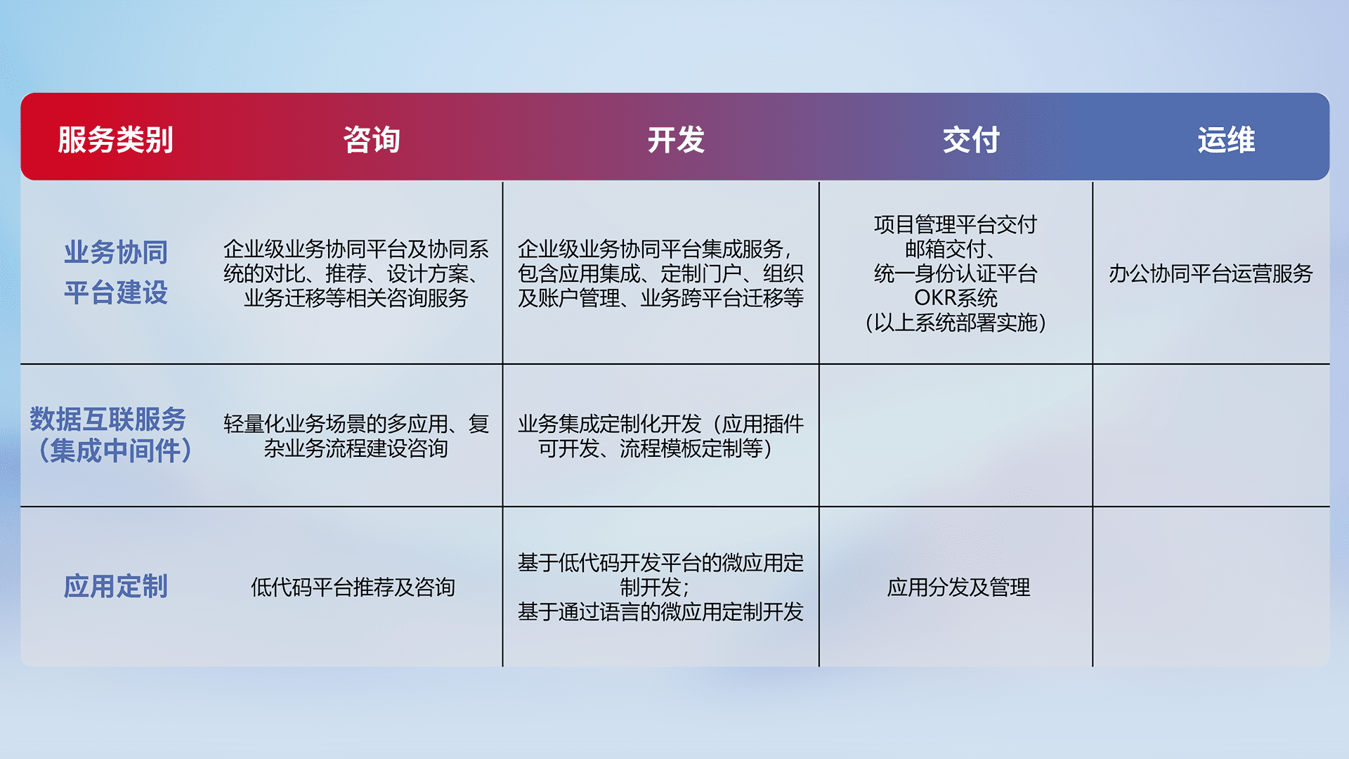 针对钉钉、、、企微、、IDaas等平台级产品提供产品的规划、、、方案、、、交付、、、、定制化开发等服务,,,实现如统一协同办公、、、智能客户服务、、、、混合会议管理、、、、智能数据查询、、等业务场景,,,,实现数字化转型。。